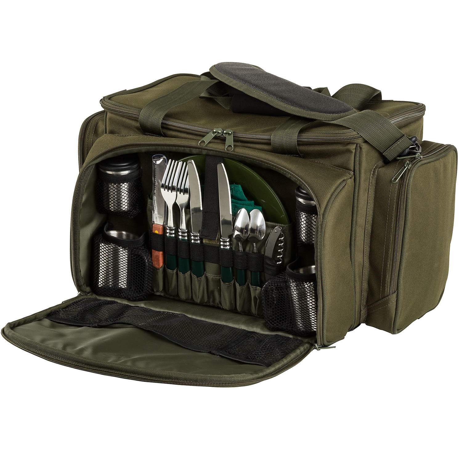 Idéal pour un ou deux pêcheurs, ce sac style panier, est équipé d'un compartiment principal isotherme, nettoyable, avec couverts et assiettes, etc., deux poches latérales spacieuses, permettant de ranger des sacs Defender, de petites et de moyennes tailles.