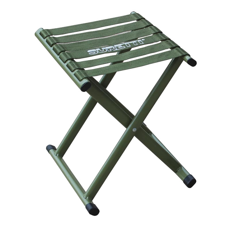 Assise simple, croix classique en profilé d'acier 26x16mm et sangles en nylon au lieu de maille. Grâce aux matériaux utilisés, le tabouret a une capacité de charge élevée de 200 kg et est étonnamment confortable et léger. Il ne pèse que 0,88 kg. Le cadre est komaxitisé avec de la peinture verte et les sangles sont fixées à l'intérieur du cadre avec du fil d'acier. La hauteur du siège déplié est de 35 cm et l'assise est de 33 x 28 cm.
