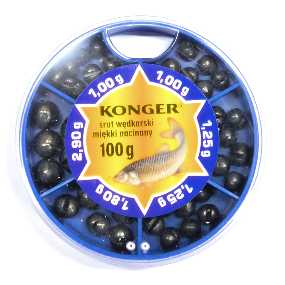 Sada dělených hrubých olověných broků v praktické krabičce na plavanou.