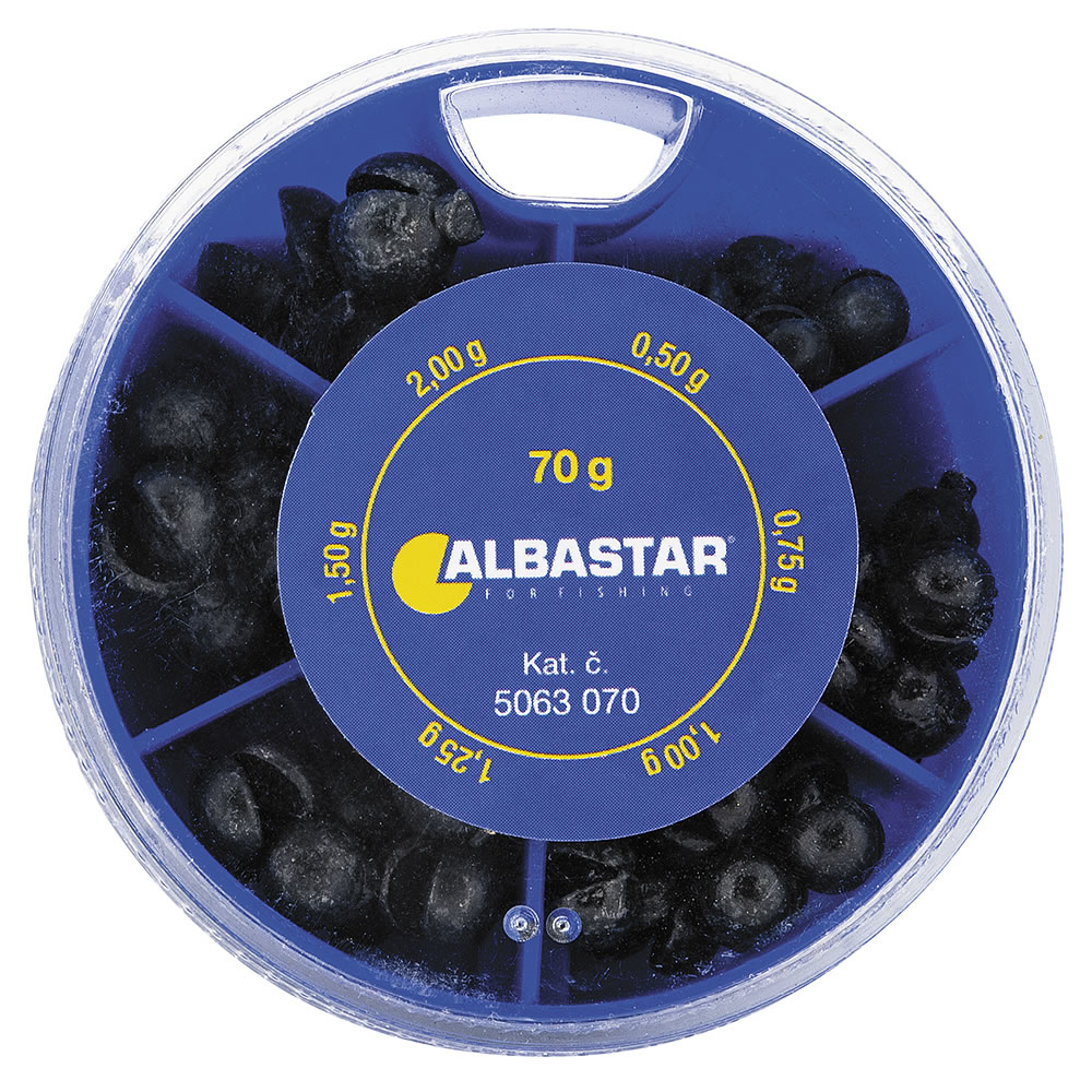 Sada hrubých dělených olověných broků v praktické krabičce na plavanou.