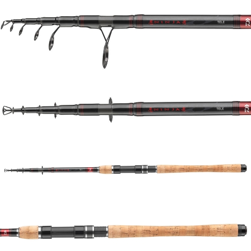 Seria wędek DAIWA Ninja X Tele to szeroka gama wszechstronnych wędzisk teleskopowych o krótkim składzie. Dzięki wysokiej jakości blanków wykonanych z włókna węglowego i lekkich przelotek, wędki z serii Ninja X Tele charakteryzują się akcją zbliżoną do akcji klasycznych wędzisk – szybka akcja i duża sprężystość pozwalają na precyzyjne rzuty i dobrą kontrolę przynęty podczas łowienia spinningowego. Pełne szczytówki z włókna węglowego są niezwykle wytrzymałe i doskonale dopasowują się do harmonijnej pracy blanków. Te teleskopowe wędki pozwalają doświadczyć kontroli przynęty, którą trudno odróżnić od klasycznej wędki jedno czy dwuczęściowej. Mocny blank o szczytowej akcji niezawodnie amortyzuje uderzenia i gwałtowne ucieczki dużych okazów i zapewnia bezpieczeństwo podczas holu. Oczywiście seria Ninja X Tele doskonale nadaje się również do łowienia gruntowego o przy użyciu spławika lub ciężarków, prawie wszystkich domowych gatunków ryb słodkowodnych. Dzięki wędziskom Ninja X Tele otrzymujesz dobrze wyważone, lekkie i najwyższej jakości wędki teleskopowe w rewelacyjnej cenie.