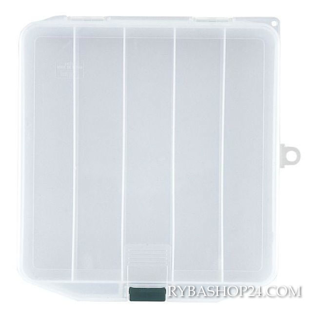 Větší typ krabičky na umělé nástrahy s pěti přihrádkami. Rozměry: 20,5 × 18,7 × 4,5 cm.