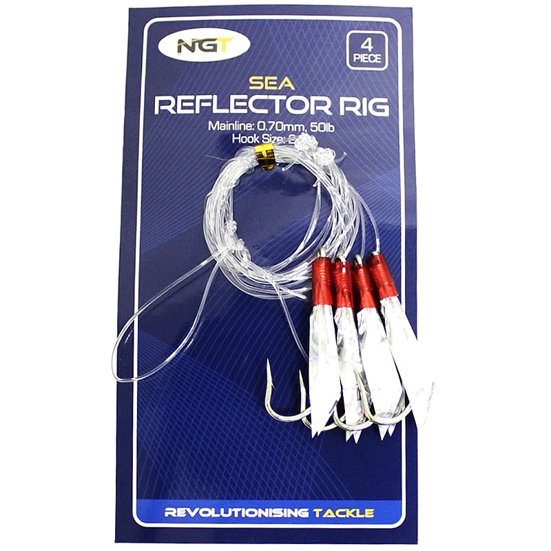 Balení čtyř kusů montáže Sea Reflector Rigs. Určeno pro mořský rybolov. Vázáno na čirý vlasec 0,70 mm / 50 lb, háčky velikost 2.