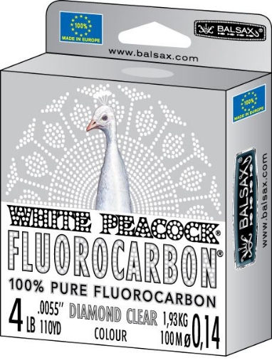 100% Fluorocarbon White Peacock je absolutně neviditelný ve vodě - má přibližně stejný index lomu světla jako voda, proto propouští UV záření. Neabsorbuje vlhkost ani po 100 hodinách a tak neztrácí pevnost. Rychle se potápí - je o více než 50% těžší než obyčejné vlasce a až o 78% těžší než voda. Má vysokou odolnost proti oděru, která je vyšší než u obyčejných vlasců, navíc je odolný proti teplotám od -40°C do + 160°C.