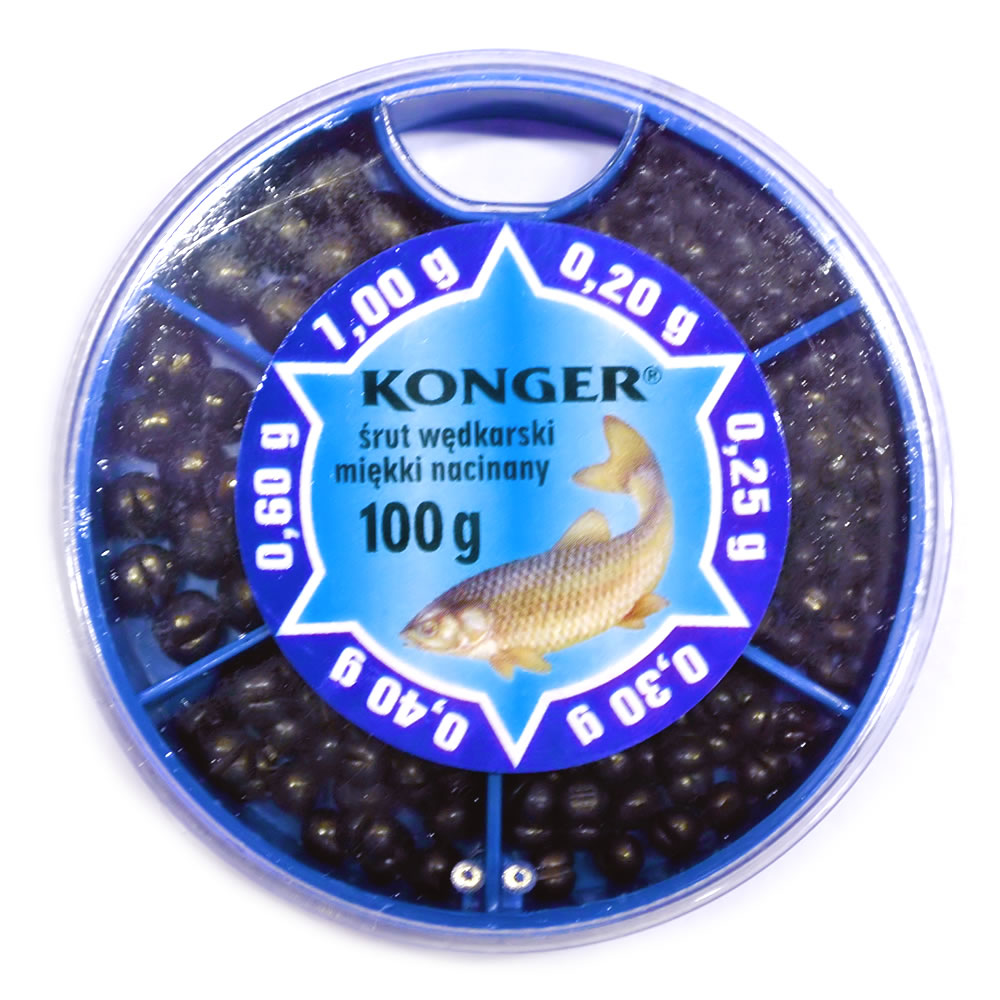 Sada dělených středně velkých olověných broků v praktické krabičce na plavanou.