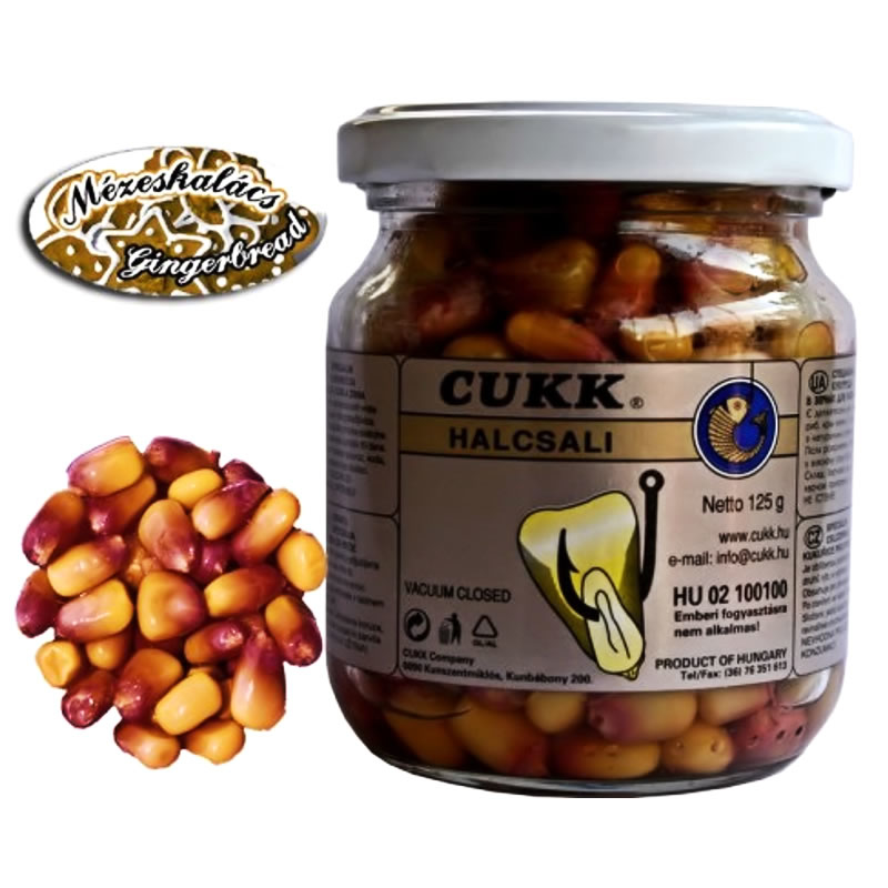 Výběrová nakládaná kukuřice bez nálevu, barvená. Různé druhy speciální kukuřice pro lov kaprovitých ryb. Velmi dobře drží na háčku, při napichování nepraská. Tvrdost a odolnost zrnek proti háčkům jsou ideální. Po otevření a pečlivém opětovném uzavření je lze používat nepřetržitě měsíce bez rizika znehodnocení. Použitá barviva jsou potravinářská, nezávadná pro zdraví a životní prostředí.