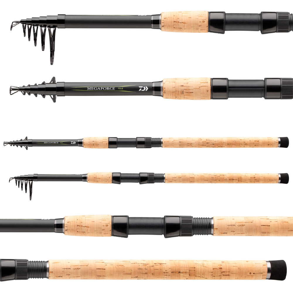 Teleskopické pruty Megaforce s délkou až 3.00m vykazují transportní délku pouze 58cm až 69cm a lze je tedy pohodlně přepravovat a skladovat. U vody jsou tyto pruty rychle připraveny k akci. Modely od 3.30m do 4.20m byly navrženy s delšími díly, aby byla zachována dobrá křivka ohybu a nahazovací vlastnosti i na těchto dlouhých prutech. Prémiový blank z uhlíkových vláken HMC+ teleskopických prutů Megaforce je vybaven lehkými keramickými očky z oxidu titanu, která jsou použitelná s pletenými šňůrami i monofilními vlasci. Osvědčené sedlo navijáku DPS spolehlivě zajistí rybářské navijáky všech velikostí a spolu s korkovou rukojetí dodává těmto prutům klasický a úctyhodný celkový dojem.
