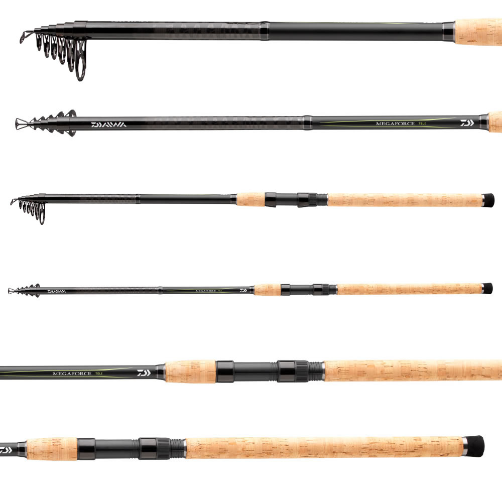 Teleskopické pruty Megaforce s délkou až 3.00m vykazují transportní délku pouze 58cm až 69cm a lze je tedy pohodlně přepravovat a skladovat. U vody jsou tyto pruty rychle připraveny k akci. Modely od 3.30m do 4.20m byly navrženy s delšími díly, aby byla zachována dobrá křivka ohybu a nahazovací vlastnosti i na těchto dlouhých prutech. Prémiový blank z uhlíkových vláken HMC+ teleskopických prutů Megaforce je vybaven lehkými keramickými očky z oxidu titanu, která jsou použitelná s pletenými šňůrami i monofilními vlasci. Osvědčené sedlo navijáku DPS spolehlivě zajistí rybářské navijáky všech velikostí a spolu s korkovou rukojetí dodává těmto prutům klasický a úctyhodný celkový dojem.