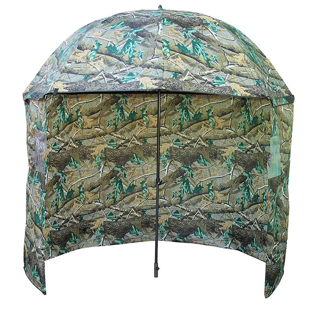 Deštník s bočnicí s krásným a moderním camo vzorem je vyrobený z 210D materiálu s podlepenými švy. Po obvodu vrchlíku jsou čtyři očka k ukotvení, deštník je dodáván se čtyřmi stavitelnými provazy a kolíky. Vrchlík lze naklopit pomocí kovového kloubu, žebra jsou z ocelových drátů 1.25 m dlouhých, eloxovaných černou barvou. Středová tyč je teleskopická s novým, velmi spolehlivým adaptérem, který vnitřní trubku svírá po celém obvodě. Průměr rozloženého deštníku je 200 cm, výška bočnice 140 cm. Transportní délka je 1.35 m, váha 3.1 kg. Deštník je dodáván v přepravním obalu.