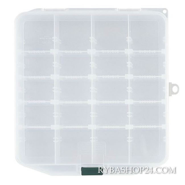 Větší transparentní krabička se 4-mi podélnými přihrádkami s volitelnými přepážkami. Rozměry: 20,5 × 18,7 × 4,5 cm.