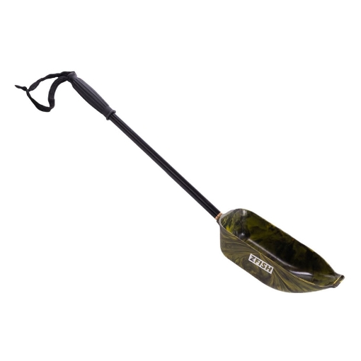 Zakrmovací lopatka ZFISH Baiting Spoon Deluxe je klasická krmná lopatka s pevnou šroubovací rukojetí o délkách 35cm, nebo 60cm. Samotná lopatka je vyrobena z odolného plastu v zeleném CAMO vzoru, má klasický, osvědčený tvar a v místě kde dochází k největšímu namáhání byl materiál zesílen. Pevná hliníková rukojeť je na konci samozřejmě opatřena gumovou rukojetí a poutkem na ruku, takže nehrozí, že si lopatku při krmení zahodíte do vody.