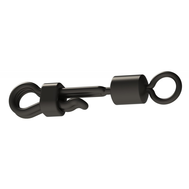 Černý antireflexní Quick Lock obratlík má místo očka rychlovýměnou sponu s pojistkou. Velikost 8 pasuje do klasických Závěsů na boční zátěž. Umožňuje rychlou a pohodlnou výměnu koncových udic.