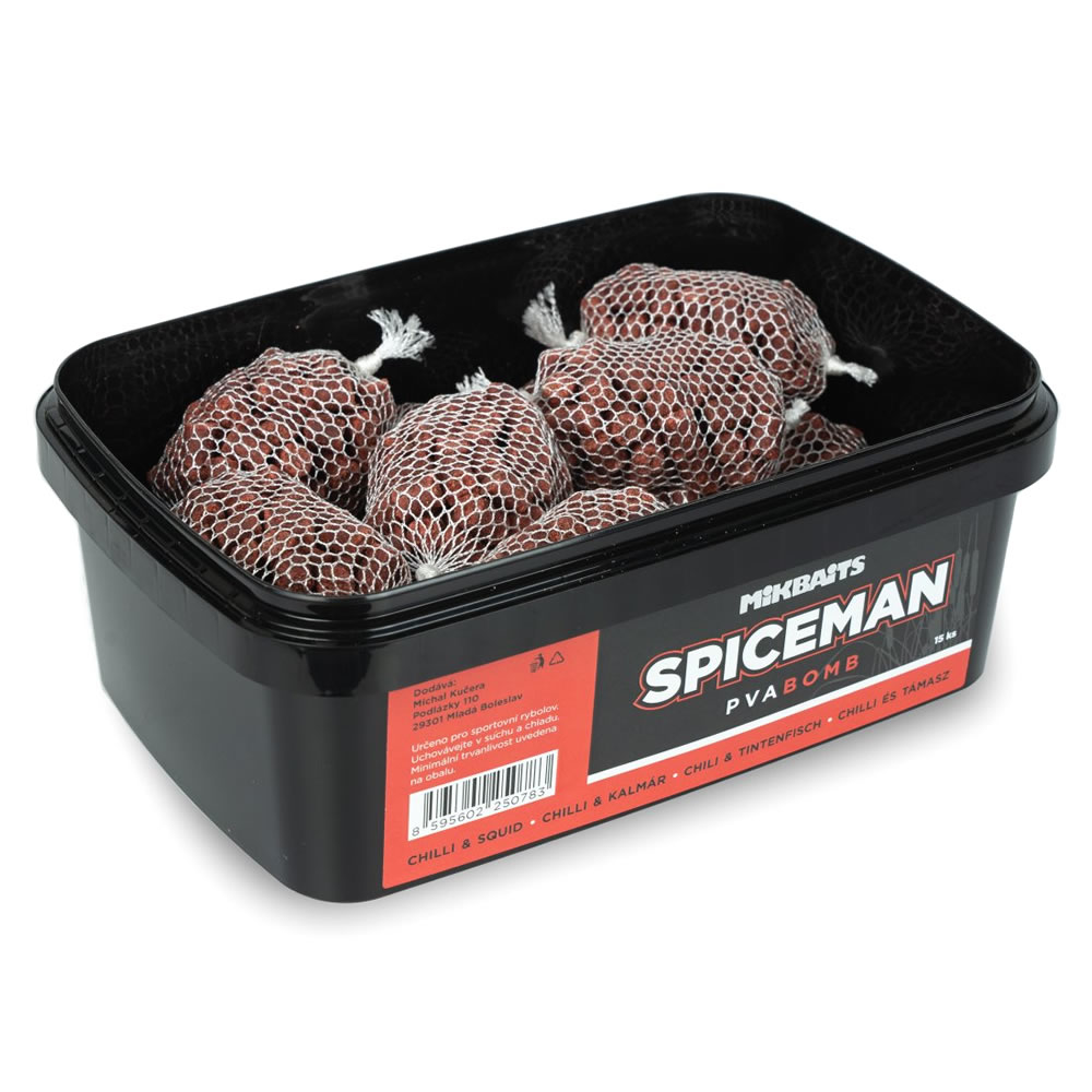PVA Bomb jsou punčochy z japonského PVA EasyFishing naplněné peletami Chilli Squid. Šetří nejen váš čas, ale i vaše peníze. Pelety mají rychlý rozpad, aby začaly okamžitě pracovat a přitahovaly ryby. Doporučujeme používat spolu s boilie Spiceman Chilli Squid.