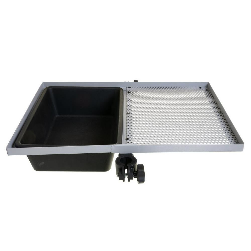 S tímto kompaktním bočním stolkem budete mít návnady a další náčiní na dosah. Perforovaná základna umožňuje snadný odtok vody a přídavné šroubení zase připevnění dalšího příslušenství. Objímky umožňují použití na sedacích boxech s různými průměry nohou.