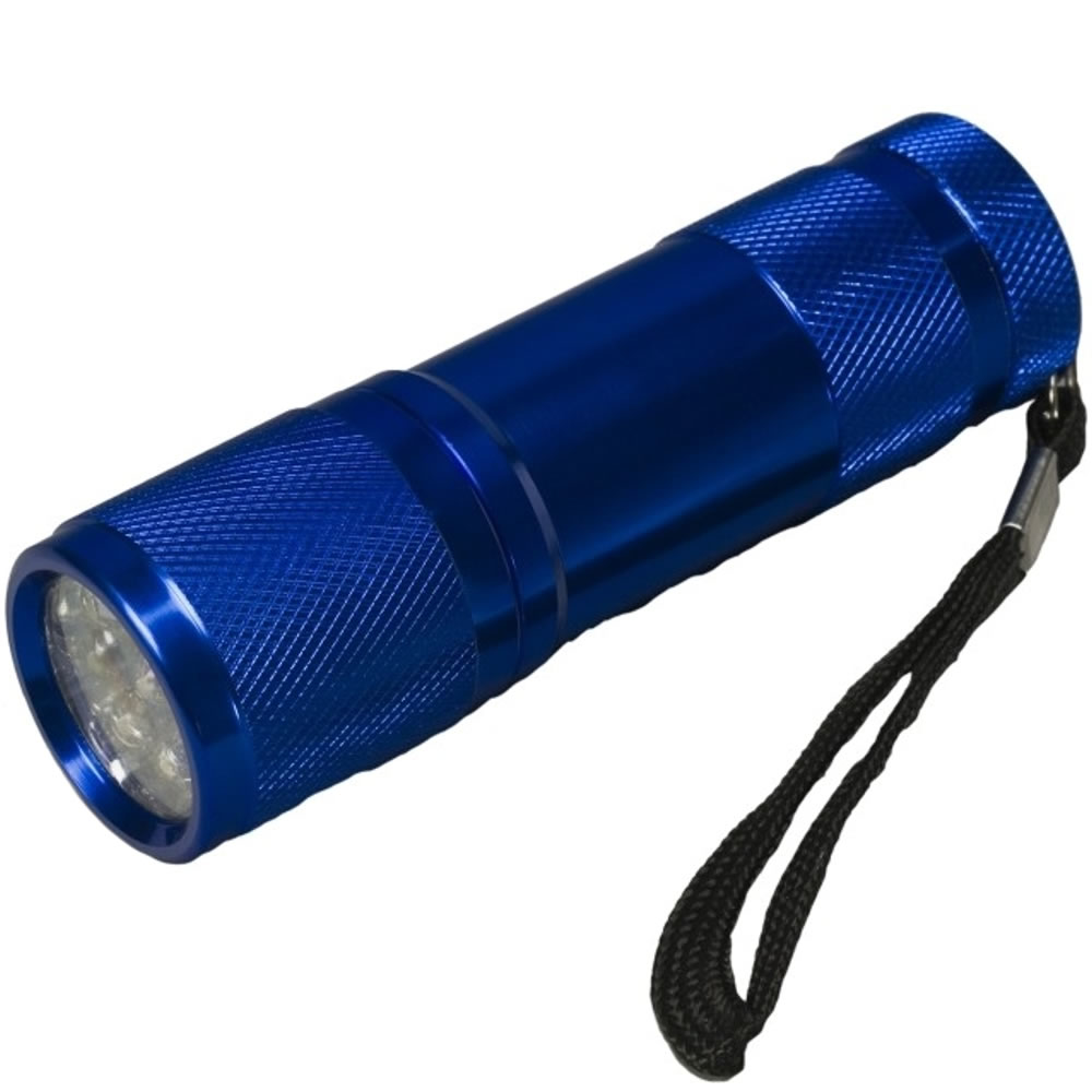 Voděodolná aluminiová ruční svítilna s 9 LED diodami a poutkem.