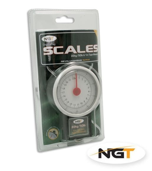 Mechanická váha pro vážení ryb. Váha je vybavena přehledným numerickým ciferníkem do 22kg a její součástí je metr.