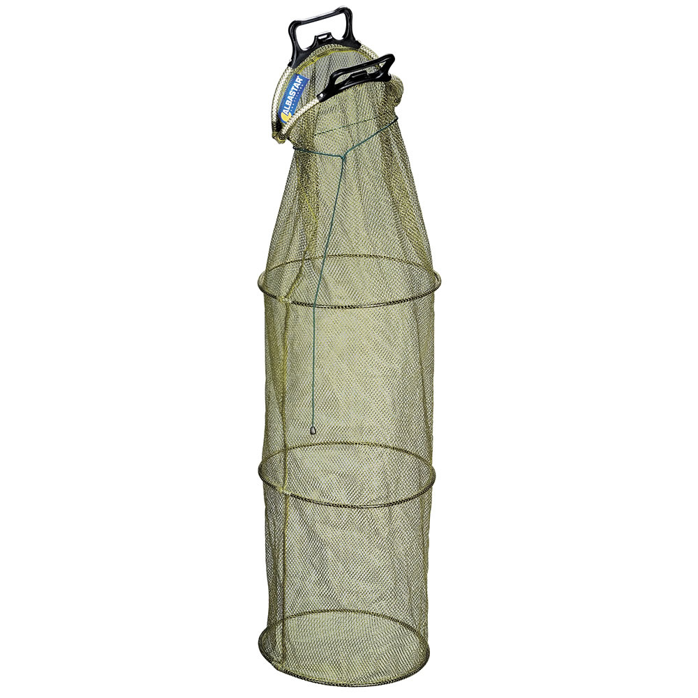 Prostorný rybářský vezírek Albastar s kruhy, pevnou síťovinou a rychlouzávěrem se speciálním aretačním systémem madla proti úniku ryb.