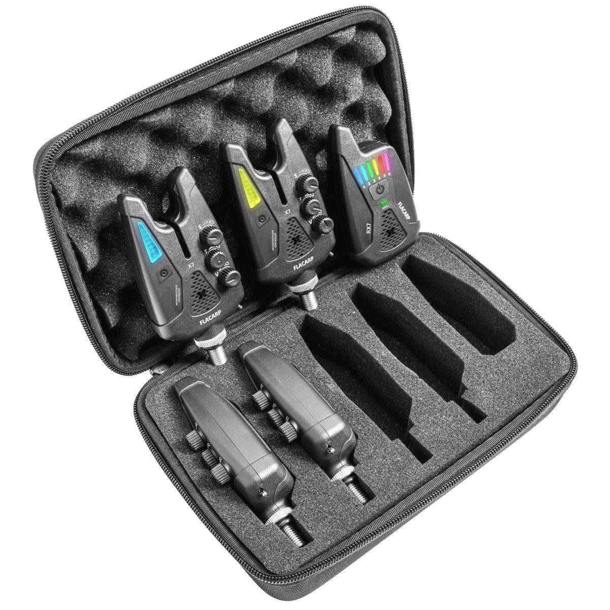 Das Flaggschiff-Set FLACARP X7 4+1 ist die umfangreichste Lösung für Angler, die mit vier Ruten operieren. Die X7 Bissanzeiger sind mit einem Spitzen-Sensor (ab 1,5 mm) und einstellbaren RGB-LEDs ausgestattet. Der RX7 Empfänger wertet Bisse inklusive Richtung und Geschwindigkeit präzise aus. Das Set steht für extreme mechanische Belastbarkeit und wird mit AAA-Batterien betrieben.