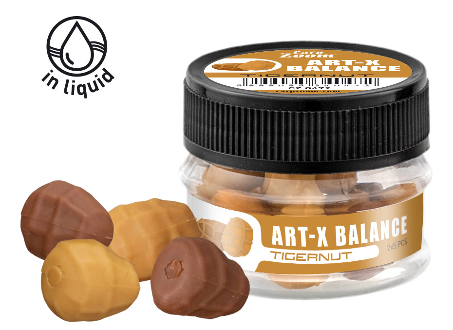 Realistic imitation of tiger nuts in balanced design. Pack contains 10 pcs (5 light, 5 dark) soaked in aromatic dip with tiger nut flavor. Ideal as emergency bait or combined with real nuts/boilies.
