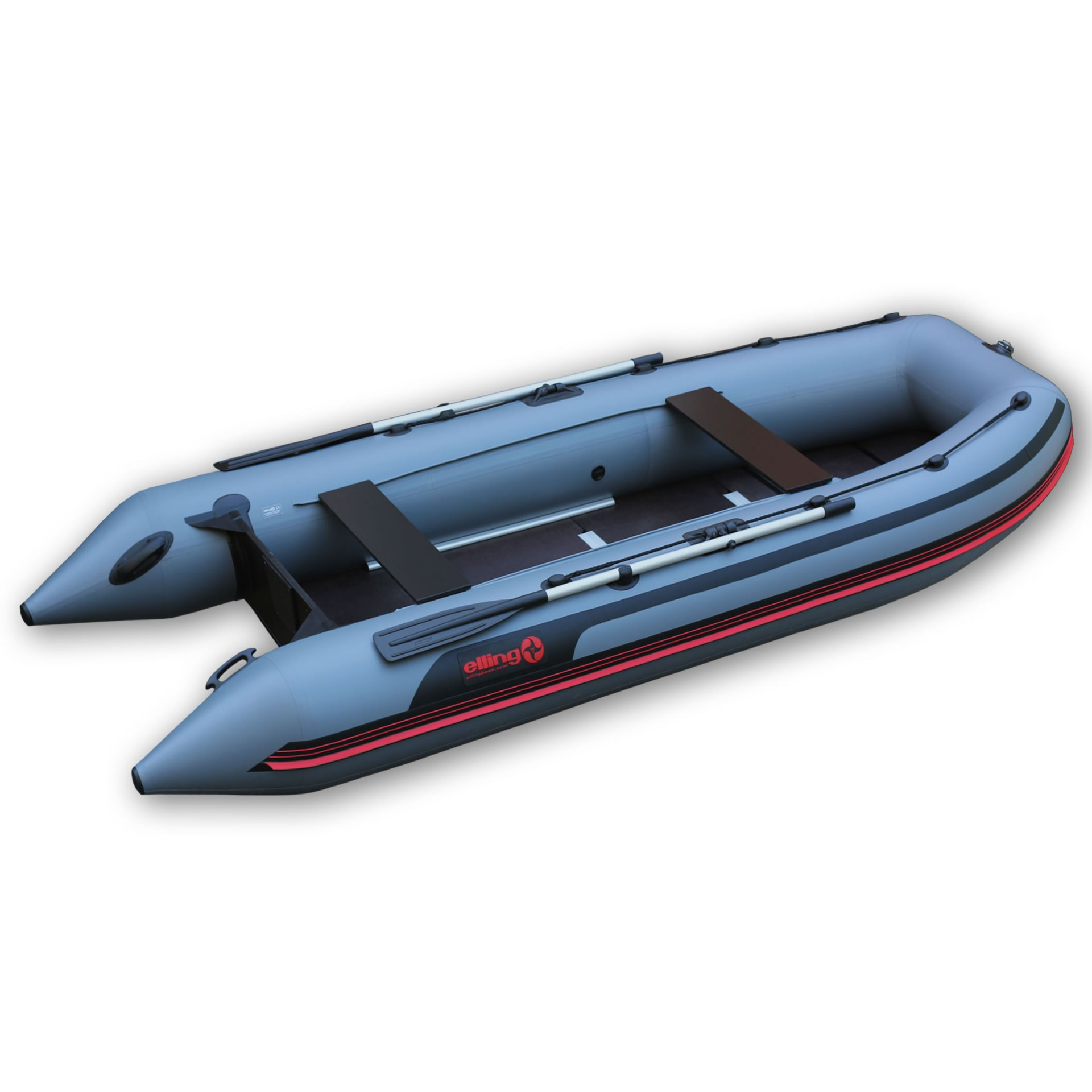 The Elling Pilot 310 in grey is a premium keel boat offering flawless handling due to advanced aerodynamics. Its sport design allows faster travel with lower fuel consumption or battery drain. Built from top-tier 1100g/m2 PVC with welded seams, ensuring maximum strength. The non-slip solid floor is reinforced with aluminum profiles for absolute standing stability. Includes an integrated Fasten mount on the bow and anti-splash features for a dry ride.
