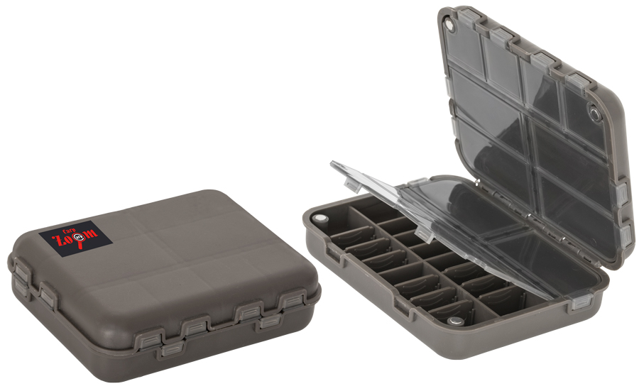 Smart two-sided box for storing small terminal tackle (swivels, snaps, rings). Features compact size and unique closure system: two halves held together by strong magnets.