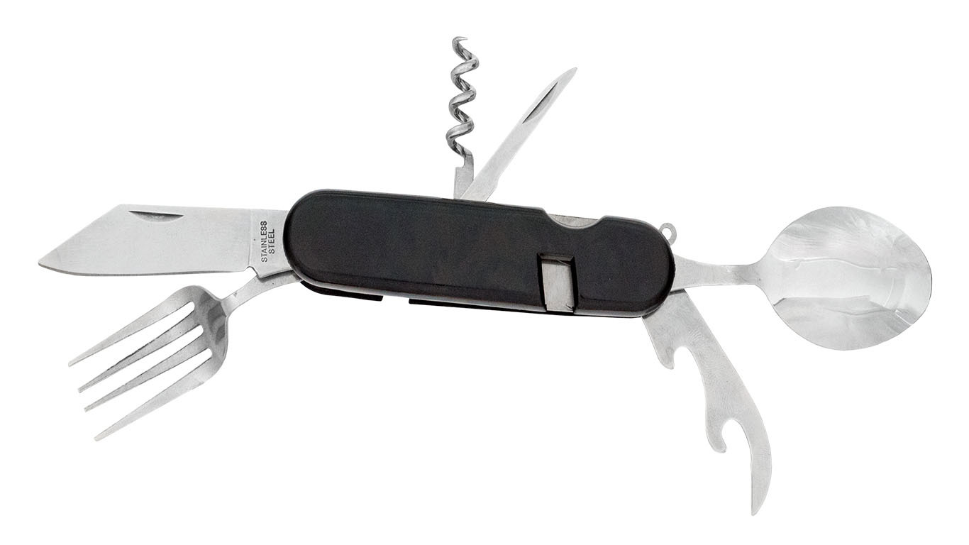 Ideal companion for camping and eating outdoors. This folding tool creates a knife, fork, spoon, can opener, and corkscrew. Can be separated into two parts to use as a full cutlery set.