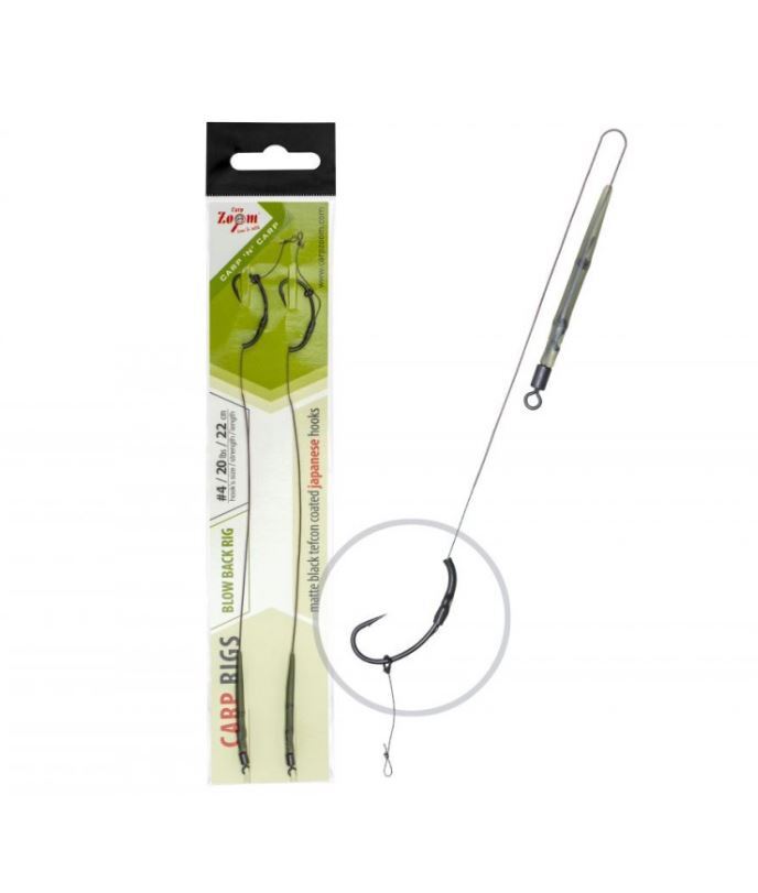 Professionally tied Blow Back Rig, considered one of the most successful rigs for big carp. Based on a size 4 hook with a rig ring on the shank, allowing the bait to slide back upon ejection while the hook aggressively turns into the lip. Tied on quality 25lb braid. Ideal for bottom boilies or snowman presentations.