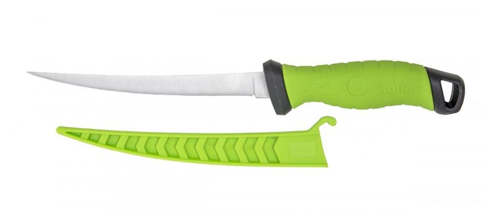 Modern fillet knife with a thin and flexible stainless steel blade. Extreme sharpness allows precise fish processing. The handle is non-slip and easy to clean. Safety plastic sheath protects the edge during transport.