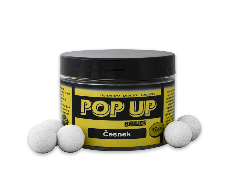 Larger 16mm variant of Garlic floating boilies in a jar. Strong buoyancy is ideal for demanding presentations (Chod Rig) or lifting heavier hooks. White color is highly visible.