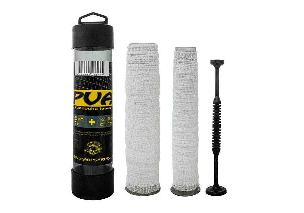 Complete set of high-quality PVA mesh (EU production) for effective spot baiting. Package includes two tubes with mesh diameters 25 mm and 35 mm (7 m each) and a double-ended plunger. The fine knit from thin threads is strong and dissolves reliably even in cold water.