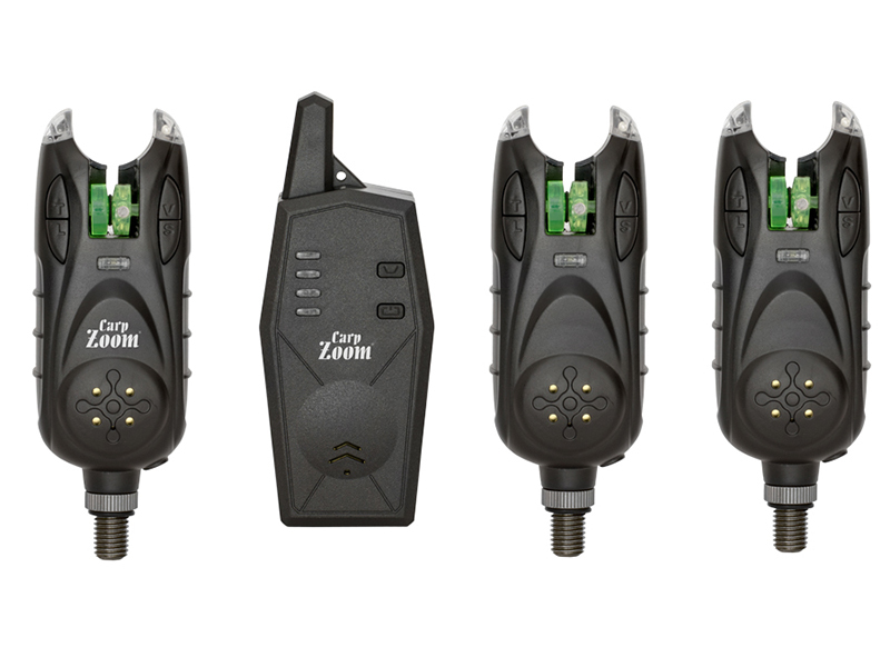 Professional set in a practical case. Alarms feature a sensitive magnetic roller sensor detecting even subtle bites. Both receiver and alarms distinguish bite direction (run vs. drop-back) via sound and light (25s latching LED).
