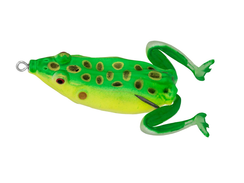 Color variant of the Jumping Frog model. Thanks to the soft hollow body, it collapses upon the bite to expose sharp double hooks, ensuring a successful set. Perfect weapon for lily pad fields.