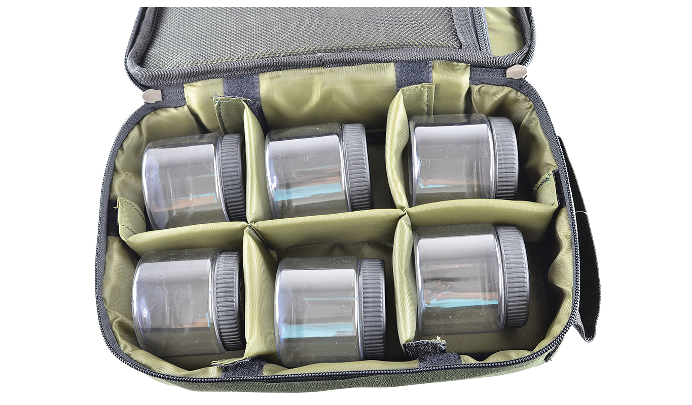 Practical padded bag for safe storage of liquid attractors. Includes 6 plastic jars with sealing lids in separate compartments. Front zip pockets for storing needles, drills, or PVA materials. Compact dimensions.